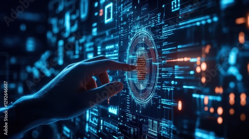 Futuristic Hand Interaction with Digital Circuitry Interface and Data Visualization in Tech Environment