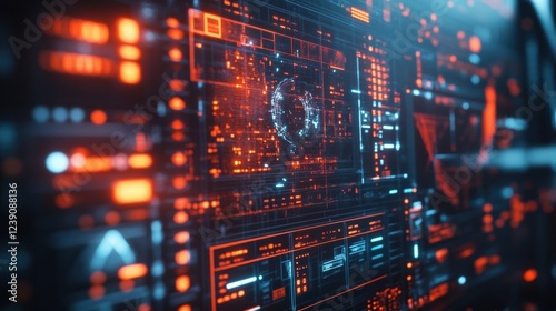 Futuristic head up display - hud - interface showing rotating globe and complex data analysis visualization in orange and blue, representing innovative production and advanced technology