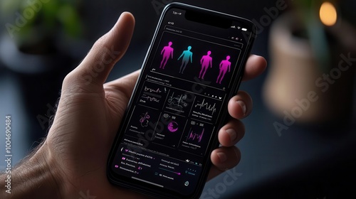 Futuristic health app powered by AI tracking daily activity, sleep, and diet, offering real-time health advice, AI health app, personalized health management