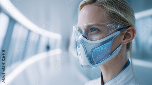 Futuristic health technology concept featuring a person in an advanced smart mask with data display. Perfect for innovation, science fiction, and health tech themes. AI, healthcare, future.