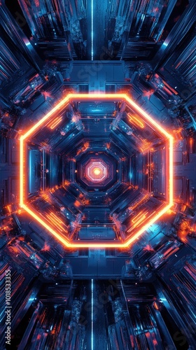 Futuristic hexagonal corridor featuring glowing neon lights and intricate technology, perfect for sci-fi themes and digital art.
