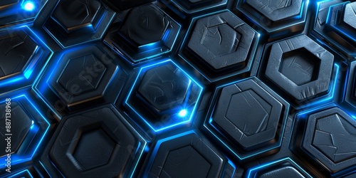 Futuristic hexagonal shapes with blue neon lighting, abstract digital background design, technology concept