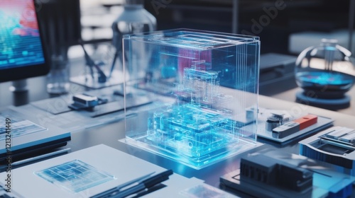 Futuristic hologram displays a complex machine design within a glass cube. Surrounded by advanced technological equipment in a modern laboratory. Showcasing innovation and technological advancement