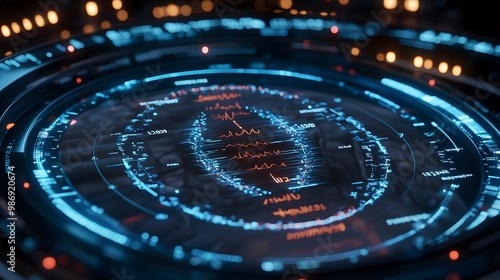 Futuristic hologram of a DNA sequence on a medical screen, featuring a digital HUD with health data and 3D technology.