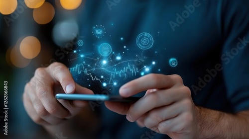 Futuristic holographic business finance display with hand swiping gesture Interactive digital dashboard showcasing financial data charts and analytics in a modern
