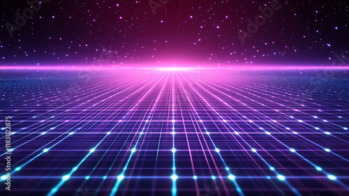 Futuristic holographic grid 3D illustration of artificial intelligence neural network abstract background, neon magenta, and blue gradient color tones. Minimalist abstract geometric shapes start sky