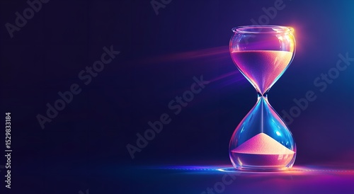 Futuristic holographic hourglass with flowing digital data on dark background — symbol of time, innovation, and business technology