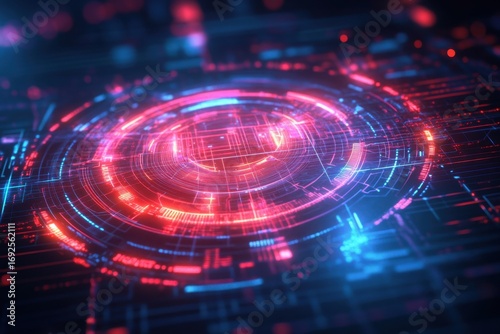 Futuristic holographic interface neon circle digital circuit glowing display technology visualization interface design cyber background blue and pink light