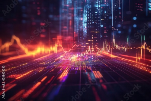 futuristic holographic stock market data overlaid on dramatic american flag waving in sunset with glowing grid lines
