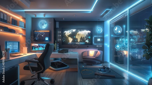 futuristic home office setup with integrated smart home technology controlling lighting, temperature, and security