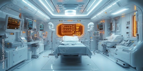 Futuristic hospital room with medical equipment and a bed in the middle.