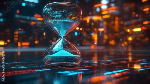 Futuristic Hourglass with Digital Sand and City Lights in the Background