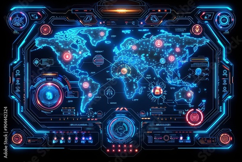Futuristic HUD with a digital world map, showcasing global connectivity and advanced technological interfaces, Generative Ai