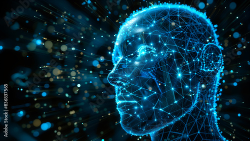 Futuristic Human Face with Digital Network and Glowing Blue Connections