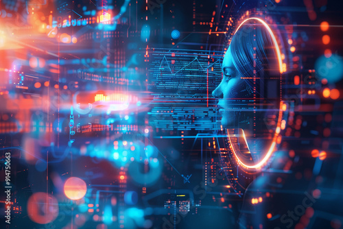 Futuristic humanoid head brain glowing with digital data and wireframe in server room. Artificial intelligence, people and technology concept.