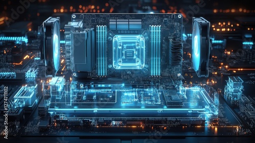 Futuristic illuminated circuit board with glowing components in digital landscape