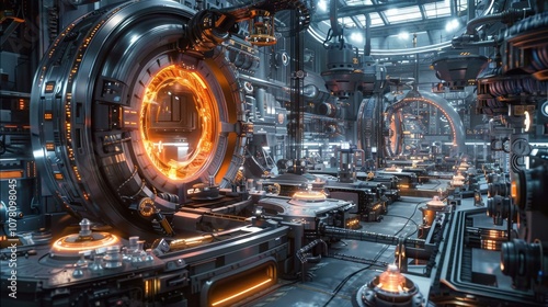 Futuristic industrial complex with glowing orange lights. AI.