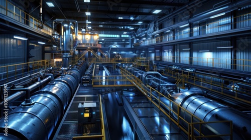 Futuristic industrial factory interior with intricate network of steel pipes machinery and equipment for manufacturing and production processes in a modern warehouse environment