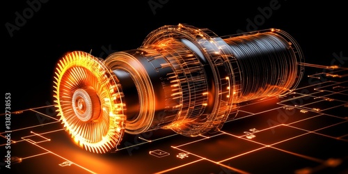 Futuristic Industrial Gas Turbine Engine with Glowing Lines, on a Circuit Board, 3D Render