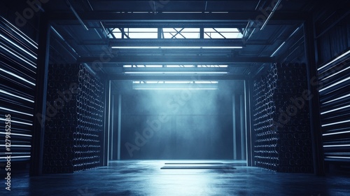 Futuristic industrial interior, dimly lit warehouse with stacked pipes and concrete floor, perfect for sci-fi or tech background.