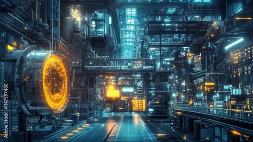 Futuristic industrial revolution high-tech factory digital artwork neon environment wide angle innovation concept