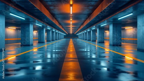 Futuristic Industrial Space With Blue, Orange Lighting in Grungy Cement Environment. Generative AI