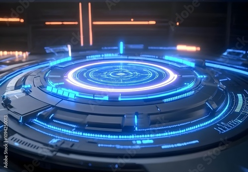 Futuristic Interface Design Featuring Neon Blue and Orange Elements with a Circular Hub and Digital Patterns for High-Tech Environments and Creative Projects