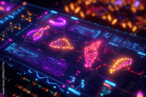 Futuristic interface displaying glowing DNA strands and data streams.