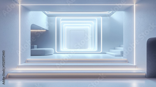 Futuristic interior space illuminated by sleek, glowing lines. Modern design with an emphasis on minimalistic and elegant lighting