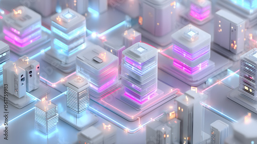 Futuristic isometric server system with glowing blue layers and data links, perfect for digital infrastructure and tech visualization banners.