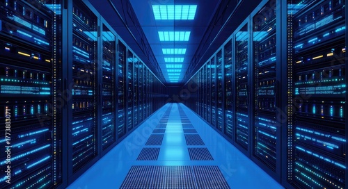 Futuristic IT data center interior with glowing blue server racks and reflections, ideal for AI cloud infrastructure visuals, digital technology ads, or business innovation designs