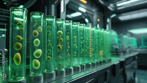 Futuristic lab with test tubes containing glowing organisms