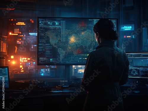 Futuristic laboratory filled with scientists analyzing data and conducting groundbreaking research at night. Generative AI