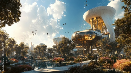 Futuristic Landscape with Floating Structures and Lush Gardens in a Vibrant Cityscape