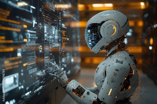 futuristic logistics hub with robotic arms and conveyor belts worker oversees operations via holographic interface symbolizing technological advancement in supply chain management