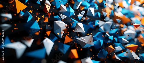 Futuristic low poly shapes in blue, orange, and white on a dark black background. High-detail 3D rendering.