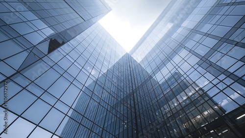 Futuristic low-angle shot of a modern glass office building reflecting the sky