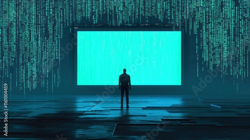 Futuristic Man Standing Before a Large Digital Screen with Code