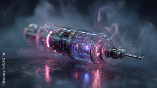 Futuristic medical syringe glowing with vibrant purple and pink light on a reflective dark surface amidst atmospheric mist representing advanced
