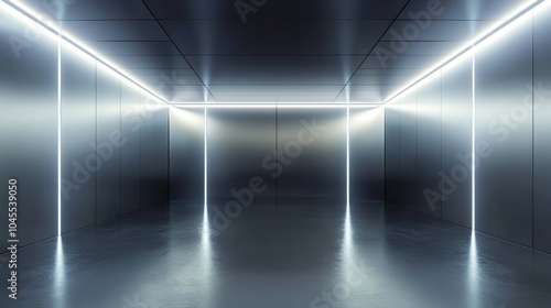 Futuristic metallic room with sleek walls, ambient lighting strips creating a modern, immersive atmosphere