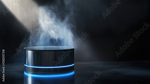 Futuristic Metallic Silver Podium with a Glowing Blue Neon Rim Positioned in a Dimly Lit Black Room Enhanced by Faint Light Rays and Atmospheric Mist as a Centerpiece for High-Tech Product Photography