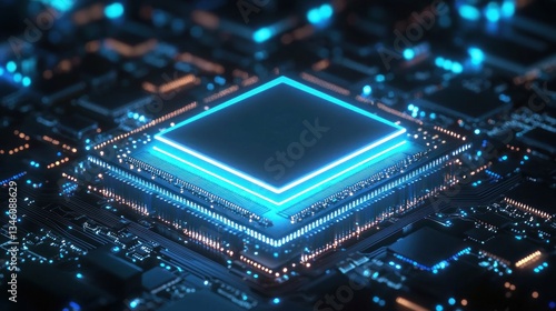Futuristic Microchip: Glowing Blue CPU on Circuit Board