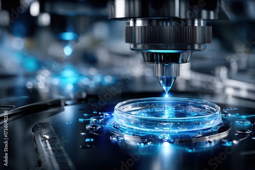 Futuristic Microscope Analyzing Sample in Petri Dish