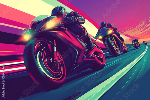 Futuristic motorcyclists racing on a vibrant road with dynamic colors and motion effects.