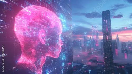 Futuristic neon cityscape with digital silhouette overlooking skyscrapers at sunset