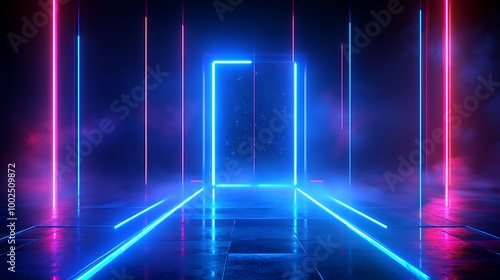 Futuristic neon doorway with glowing lights and reflections, creating a mystical atmosphere.