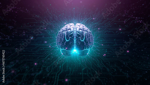 Futuristic Neon Glowing Brain – Artificial Intelligence, Neural Networks and Digital Technology Concept