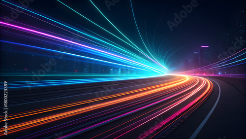 Futuristic Neon Light Trails on Highway With Motion Blur at Night