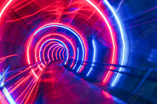 Futuristic Neon Light Tunnel with Red and Blue Glowing Circular Patterns