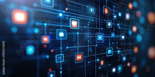 Futuristic network visual with digital icons. Online connectivity and multimedia technology intertwine. Modern web interface, abstract symbolism, suitable for tech platforms.